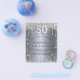 A modern, stylish and glamorous invitation for a 50th birthday party. A faux silver looking background, decorated with glitter dust. Personalize and add your name and party details. Number 50 is written with a balloon style font, script.