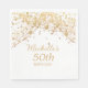 50th birthday party custom paper napkins for women with glittering gold string lights and sparkling bokeh on a white background. Because text is customizable, this paper napkin is designed for a lady who is celebrating any birthday. (18th, 21,st, 30th, 40th, 50th, 60th, 70th, 80th, 90th, 100th....or any age). Personalized with her name and age. Text, fonts and wording are completely customizable. Contact us for help with customization or matching products.