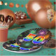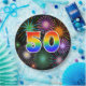 This cheerful, fun, and colorful paper plate design features a large number "50" containing a rainbow spectrum gradient inspired pattern coloring. It also features a exciting and vibrant bursting celebratory fireworks inspired pattern. The background is colored black. Fun paper plates like this might be used at somebody’s fiftieth birthday party, a 50th anniversary celebration, or some other fiftieth event. [~Z0000490]