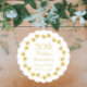 Set of 6 round, absorbent, pulp board drink coasters for a 50th Golden Wedding Anniversary celebration that feature a gold color ivy wreath along with celebrants' names and wedding anniversary date. Edit and replace names and date with your own.