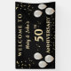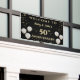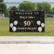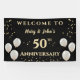 A 50th Golden Wedding Anniversary Celebration Hanging Banner with Couples Names. Designed with white and golden balloons on a black background with gold confetti. The text includes: Welcome to, The Couple's First Names, and 50th Anniversary. To personalize, simply replace the sample names with the couples first names (adding 's).