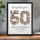 Looking for a special way to honor someone turning fifty? This customizable happy 50th birthday poster collects meaningful photos that make up the number fifty. The sentimental 'through the years' title adds a heartfelt touch, and you can personalize the text for that unique gift.