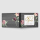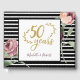 Elegant and chic 50th wedding anniversary guest book with watercolor red roses on black and white stripe background. Elegant text design in gold and faux glitter.
