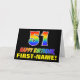 The front of this fun, colorful, and cheerful birthday-themed greeting card design features a large number "51" and the message "HAPPY BIRTHDAY,", both having a rainbow spectrum gradient inspired pattern coloring, along with a bold yellow customizable recipient name. The front also features a minimal black colored background. The inside has a personalized birthday greeting message, or could perhaps be cleared and left blank if a message is to be written by hand instead. A cheerful customizable birthday card like this might be a fun way to send a message celebrating somebody’s fifty first birthday. [~Z0000472]