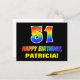 The front of this colorful, cheerful, and fun birthday postcard design features a large number "51" and the message "HAPPY BIRTHDAY,", both colored with a rainbow spectrum gradient inspired pattern, along with a bold yellow editable recipient name. The front also has a minimalist, simple, black colored background. The back of the postcard features a custom birthday greeting message, or could perhaps be cleared and left blank if a message is to be written by hand instead. A vibrant customizable birthday postcard like this might be a fun way to celebrate somebody’s fifty first birthday. [~Z0000474]