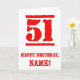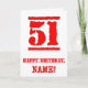 This fun birthday greeting card design features a large red number “51” having a rubber stamp inspired appearance, along with the birthday greeting message “HAPPY BIRTHDAY,” and an editable name on the front. The inside has a customized birthday greeting message, or could perhaps be cleared and left blank if a message is to be written by hand instead. A fun customizable birthday greeting card like this might be sent in celebration of somebody’s fifty-first birthday. [~Z0000524]