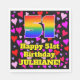 This fun and joyful birthday paper napkin design features a large number “51” with a rainbow spectrum gradient inspired pattern, along with the message “Happy 51st Birthday,”, and a personalized name. The background features a pattern of heart shapes with colors like purple, red, and pink. Loving, fun paper napkins like this might be fun to have at a birthday celebration being held to honor somebody’s fifty first birthday. [~Z0000550]