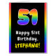 This upbeat and fun birthday greeting card design features a large number “51“ having a multicolored rainbow spectrum inspired gradient pattern, along with the message “Happy 51st Birthday,”, and a custom recipient name. The inside has an editable birthday greeting message, or could perhaps be cleared and left blank if a message is to be written by hand instead. An exciting, personalized birthday greeting card like this might be a fun way to deliver birthday greetings to somebody who is celebrating their fifty-first birthday. [~Z0000628]