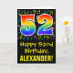 The front of this fun, colorful, and vibrant birthday greeting card design features a large number "52" having a rainbow spectrum gradient inspired pattern. It also features the message "Happy 52nd Birthday,", and an editable recipient name. The front also has a colorful music notes and symbols pattern. The inside features a customizable birthday greeting message, or could perhaps be cleared and left blank if a message is to be written by hand instead. A personalized birthday card like this might be a fun way to send a message in celebration of somebody’s fifty second birthday. [~Z0000420]