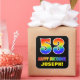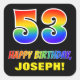 This fun, cheerful, and colorful birthday themed sticker design features a large number "53" and the message "HAPPY BIRTHDAY,", both having a rainbow spectrum gradient inspired pattern coloring, along with a bold yellow customizable name. The background is colored black. Fun stickers like this might be used when wrapping presents being given to somebody in celebration of their 53rd birthday, or perhaps might be handed out to the attendees at a birthday celebration or party. [~Z0000480]