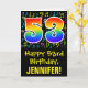 The front of this fun, colorful, and vibrant birthday greeting card design features a large number "53" with a rainbow spectrum gradient inspired pattern, along with the message "Happy 53rd Birthday,", and a customizable recipient name. The front also features a pattern of various music notes and symbols having a variety of colors and sizes. The inside features an editable birthday greeting message, or could perhaps be cleared and left blank if a message is to be written by hand instead. A personalized birthday card like this might be a fun way to send birthday wishes to a musician, singer, composer, or somebody else who is celebrating their fifty third birthday. [~Z0000420]