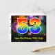 The front of this fun, colorful, and exciting birthday themed postcard design features a large number "53" with a rainbow spectrum gradient inspired pattern, along with the message "Happy 53rd Birthday,", and a personalized recipient name. The front additionally features a vibrant and colorful background pattern inspired by the look of bursting celebratory fireworks. The back features an editable birthday greeting message, or could perhaps be cleared and left blank if a message is to be written by hand instead. A birthday postcard like this might be a fun way to send birthday wishes to somebody who is celebrating their fifty third birthday. Postcards like this might also be used to invite guests to a birthday party being held for somebody who is turning 53 years old. [~Z0000446]