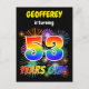 The front of this fun and vibrant birthday party invitation postcard design has a customizable name, an exciting bursting celebratory fireworks inspired pattern, and the message "53 YEARS OLD!" having a colorful rainbow spectrum inspired gradient pattern. The back features an editable message with information about the party, such as when and where it is being held. Invitation postcards like this might be sent to potential attendees of a birthday party being held in celebration of somebody’s fifty third birthday. [~Z0000452]