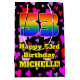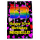 This fun and joyful birthday themed giftbag design features a large number “53” having a rainbow spectrum gradient inspired pattern. It also features the message “Happy 53rd Birthday,”, and an editable name. The background features a pattern of red, purple, and pink heart shapes. A gift bag like this might be used when wrapping gifts being given to somebody in celebration of their fifty third birthday. [~Z0000551]