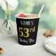 This elegant and fancy birthday paper cup design features an editable name and the message “53rd Birthday Party”. The large number “53rd” has an imitation/faux gold-inspired coloring pattern, the words “Birthday Party” are in luxurious script-style text, and the background is colored black by default (although it can be customized). Luxurious, opulent paper cups like this might be used at a birthday party being held to celebrate somebody’s 53rd birthday. [~Z0000567]