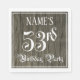 This elegant and ornate birthday-themed paper napkin design features a customizable name and the message “53rd Birthday Party”. The large number “53rd” and the words “Birthday Party” are in elaborate script-style text, and the background features a faux/imitation woodgrain-inspired pattern. Fancy, elaborate paper napkins like this might be used at a birthday celebration being held in celebration of somebody’s 53rd birthday. [~Z0000564]