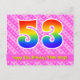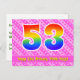 The front of this upbeat, happy, and fun birthday-themed postcard design features a large number "53" with a rainbow spectrum gradient inspired pattern, along with the message "Happy 53rd Birthday,", and a personalized recipient name. The front additionally features a cheerful light pink and dark pink heart shapes and stripes pattern. The back features a custom birthday greeting message, or could perhaps be cleared and left blank if a message is to be written by hand instead. A customizable birthday postcard like this might be a fun way to send a message celebrating somebody’s fifty third birthday. Postcards like this might also be used to invite guests to a birthday celebration being held for somebody who is turning 53 years old. [~Z0000449]