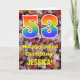 The front of this colorful, rustic, and nature-inspired birthday greeting card design features a large number "53" with a rainbow spectrum gradient inspired pattern, along with the message "Happy 53rd Birthday,", and a personalized name. The background of the front of the card features a rustic fallen autumn leaves pattern. The inside features a personalized birthday greeting message, or could perhaps be cleared and left blank if a message is to be written by hand instead. A personalized birthday card like this might be a fun way to send a message in celebration of somebody’s fifty third birthday. [~Z0000384]