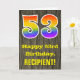 The front of this colorful yet rustic birthday greeting card design features a large number "53" with a rainbow spectrum gradient inspired pattern, along with the message "Happy 53rd Birthday,", and a customizable recipient name. The front features a background depicting a rustic faux wood grain look pattern. The inside features a customizable birthday greeting message, or could perhaps be cleared and left blank if a message is to be written by hand instead. A customizable birthday card like this might be a fun way to celebrate somebody’s fifty third birthday. [~Z0000419]
