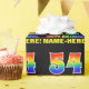 This cheerful, colorful, and fun birthday themed wrapping paper design features a large number "54" and the message "HAPPY BIRTHDAY,", both having a rainbow spectrum gradient inspired pattern coloring, along with a bold yellow editable recipient name. The background is colored black. Fun wrapping paper like this might be used when wrapping gifts being given to somebody in celebration of their 54th birthday. [~Z0000475]
