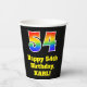 This fun and exciting birthday paper cup design features a large number “54” having a rainbow spectrum gradient inspired pattern. It also features the message “Happy 54th Birthday,”, and a customizable name. It also has a black-colored background. Vibrant, colorful paper cups like this might be fun to use at a birthday party being held in celebration of somebody’s fifty fourth birthday. [~Z0000537]