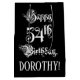This ornate and elegant birthday-themed giftbag design features the message “Happy 54th Birthday,” in fancy script style text, on a black colored background. It also features a customizable recipient name. A formal birthday themed gift bag like this might be used when giving a gift or present in celebration of somebody’s fifty fourth birthday. [~Z0000557]