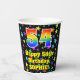 This fun and colorful birthday paper cup design features a large number “54” having a rainbow spectrum gradient inspired pattern. It also features the message “Happy 54th Birthday,”, and an editable name. The background features a multicolored pattern featuring many star shapes with different colors and sizes. Colorful, vibrant paper cups like this might be fun to have at a birthday party being held in celebration of somebody’s fifty fourth birthday. [~Z0000540]