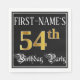 This elegant and fancy birthday themed paper napkin design features a personalized name and the message “54th Birthday Party”. The large number “54th” has a faux/imitation gold-inspired coloring pattern, the words “Birthday Party” are in opulent script-style text, and the background is colored black by default (although it can be customized). Opulent, luxurious paper napkins like this might be useful at a birthday party being held to honor somebody’s fifty fourth birthday. [~Z0000565]