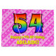 This happy and festive 54th birthday themed gift bag design features a large number "54" having a rainbow spectrum inspired gradient pattern. It also features the message "Happy 54th Birthday,", followed by an editable name. The background features a cheerful pattern of dark pink and light pink stripes containing loving pink heart shapes. A gift bag like this might be used when wrapping presents or gifts being given to celebrate somebody’s fifty fourth birthday. [~Z0000414]