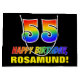 This colorful, cheerful, and fun birthday themed gift bag design features a large number "55" and the message "HAPPY BIRTHDAY,", both colored with a rainbow spectrum gradient inspired pattern, along with a bold yellow customizable recipient name. The background is colored black. A fun gift bag like this might be used when wrapping gifts being given to somebody in celebration of their fifty fifth birthday. [~Z0000477]
