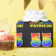 This colorful, cheerful, and fun birthday-themed wrapping paper design features a large number "55" and the message "HAPPY BIRTHDAY,", both having a rainbow spectrum gradient inspired pattern coloring, along with a bold yellow personalized recipient name. The background is colored black. Fun birthday themed wrapping paper like this might be used when giving a gift or present in celebration of somebody’s fifty fifth birthday. [~Z0000475]