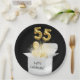 Gold balloons with sparkles and ribbons in a white box on black background for 55th birthday party.