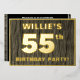 The front of this bold fifty-fifth birthday celebration foil invitation card features a custom name, a large number “55th”, the message “BIRTHDAY PARTY!”, and a border, all in foil. There is a rustic, yet sophisticated, faux wood grain appearance inspired pattern for the background of the front. The back features personalized details about the event, such as the date, time, venue/location, and any other important information. Customizable invitations like these might be used to invite attendees to a birthday party being held in celebration of somebody’s 55th birthday. [~Z0000598]