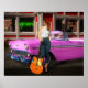 Beautiful woman standing in front of a 50'S diner and a 1956 convertible car holding her Rockabilly guitar