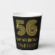 This Roaring Twenties inspired and vintage appearance birthday paper cup design features a large art deco inspired style number “56”, along with the birthday greeting message “Happy 56th Birthday,” and a personalized name. It also has a black-colored background. Birthday themed paper cups like this might be used at a party celebrating somebody’s fifty sixth birthday. [~Z0000546]