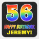 This fun, colorful, and cheerful birthday sticker design features a large number "56" and the message "HAPPY BIRTHDAY,", both having a rainbow spectrum gradient inspired pattern coloring, along with a bold yellow custom name. The background is colored black. Fun birthday themed stickers like this might be used when wrapping a gift or present being given to somebody who is celebrating their 56th birthday, or perhaps might be given out to the attendees at a birthday celebration. [~Z0000480]