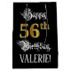 This elegant and luxurious birthday-themed giftbag design features the message “Happy 56th Birthday,”, along with an editable recipient name. Part of the message is in an ornate script-style text, the large number “56th” features a faux/imitation gold-inspired look pattern, and the background is colored black. An opulent birthday themed giftbag like this might be used when giving a gift or present in celebration of somebody’s fifty sixth birthday. [~Z0000560]