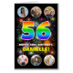 The front of this exciting and upbeat birthday themed greeting card design features a big number “56“ having a colorful rainbow spectrum inspired gradient pattern, along with the message “HAPPY 56th BIRTHDAY,” and an editable name, on a multicolored bursting fireworks inspired pattern. At the top and the bottom of the front are images that can be personalized with photos of the recipient’s family and/or friends. The inside has an editable birthday greeting message, or could perhaps be cleared and left blank if a message is to be written by hand instead. A joyful, personalized birthday greeting card like this might be used to celebrate somebody’s fifty-sixth birthday. (Photography © Storytree Studios, Stanford, CA.) [~Z0000661]