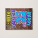 This fun birthday themed puzzle design features the message “HAPPY 56TH BIRTHDAY,” having a vibrant, colorful, graffiti-inspired appearance, in addition to a custom recipient name. The background features a pattern inspired by the look of a brick wall. A fun, editable birthday puzzle like this might be used to acknowledge somebody’s fifty-sixth birthday. [~Z0000532]