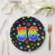 This colorful, fun, and cheerful paper plate design features a large number "56" containing a rainbow spectrum gradient inspired pattern. The background features a colorful star shapes pattern. Fun paper plates like this might be used at a party being held to celebrate somebody’s 56th birthday, or a couple’s 56th anniversary, or some other 56th event. [~Z0000493]