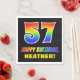 This fun, cheerful, and colorful birthday themed paper napkin design features a large number "57" and the message "HAPPY BIRTHDAY,", both having a rainbow spectrum gradient inspired pattern coloring, along with a bold yellow custom recipient name. The background is colored black. Fun, editable paper napkins like this might be used at a celebration being held to honor somebody’s 57th birthday. [~Z0000476]