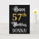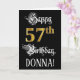 The front of this lavish and ornate birthday greeting card design features the message “Happy 57th Birthday,”, plus a personalized recipient name. Some of the message is in an elaborate script-style text. The large number “57th” features a faux/imitation gold-inspired look pattern. The background is colored black. The inside has a customizable birthday greeting message, or could perhaps be cleared and left blank if a message is to be written by hand instead. A formal, customized birthday greeting card like this might be a respectable way to deliver a birthday greeting message to somebody who is celebrating their fifty-seventh birthday. [~Z0000559]