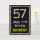 The front of this fun, garden-inspired birthday-themed greeting card design features the message “Happy 57th Birthday,” along with a customizable recipient name. The large number “57” plus the border on the front both feature flower icons. The inside has a personalized birthday greeting message, or could perhaps be cleared and left blank if a message is to be written by hand instead. A floral, customizable birthday greeting card like this might be a fun way to deliver a birthday greeting message to somebody who is celebrating their fifty-seventh birthday. [~Z0000648]