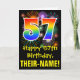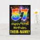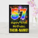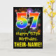The front of this fun, colorful, and exciting birthday-themed greeting card design features a large number "57" having a rainbow spectrum gradient inspired pattern. It also features the message "Happy 57th Birthday,", and a personalized recipient name. The front additionally features a colorful background pattern inspired by the look of bursting celebratory fireworks. The inside features an editable birthday greeting message, or could perhaps be cleared and left blank if a message is to be written by hand instead. A personalized birthday card like this might be a fun way to send a message celebrating somebody’s fifty seventh birthday. [~Z0000442]