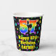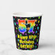 This colorful and fun birthday themed paper cup design features a large number “57” having a rainbow spectrum gradient inspired pattern. It also features the message “Happy 57th Birthday,”, and a personalized name. The background features a multicolored star field inspired pattern. Vibrant, colorful paper cups like this might be fun to have at a birthday party/celebration being held to celebrate somebody’s 57th birthday. [~Z0000540]