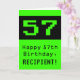 This geeky and fun birthday greeting card design features a large green classic computer gaming style number "57" on the front. It also features the birthday greeting message "Happy 57th Birthday,", and a custom name. The inside features a custom birthday greeting message, or could perhaps be cleared and left blank if a message is to be written by hand instead. A silly birthday greeting card like this might be used to send birthday wishes to somebody who is celebrating their fifty seventh birthday and who enjoys retro video gaming. [~Z0000430]