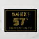 The front of this vintage-appearance fifty-seventh birthday party foil invitation features a custom name, a large art deco style inspired number “57TH”, the message “BIRTHDAY PARTY!”, and a border pattern consisting of lines. There is a black-colored background on the front by default, but it can be customized to a different color if desired. The back features personalized details about the event, such as the date, time, location, and any other information that may be relevant. Luxurious, elegant, customizable invitations like these might be used to invite guests to a birthday party being held to celebrate somebody’s 57th birthday. [~Z0000590]