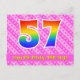 The front of this loving, happy, and cheerful birthday-themed postcard design features a large number "57" with a rainbow spectrum gradient inspired pattern, along with the message "Happy 57th Birthday,", and a custom recipient name. The front additionally features a happy light pink and dark pink striped pattern featuring heart shapes. The back features an editable birthday greeting message, or could perhaps be cleared and left blank if a message is to be written by hand instead. A birthday postcard like this might be a fun way to send birthday wishes to somebody who is celebrating their fifty seventh birthday. Postcards like this might also be used to invite guests to a birthday party or celebration being held for somebody who is turning 57 years old. [~Z0000449]