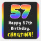 This upbeat and vibrant birthday themed square sticker design features a large number “57“ with a colorful rainbow spectrum inspired gradient pattern, along with the message “Happy 57th Birthday,”, and an editable recipient name. Stickers like these might be used when celebrating somebody’s 57th birthday. [~Z0000630]