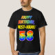 The front of this bold, exciting, and colorful birthday shirt design features a large number "58" and the message "HAPPY BIRTHDAY,", both having a rainbow spectrum gradient inspired pattern coloring, along with a bold yellow custom name. Bold and vibrant birthday-themed shirts like this might be worn by the guests at a party being held to celebrate somebody’s fifty eighth birthday. [~Z0000473]